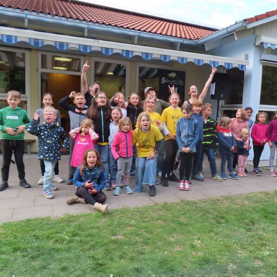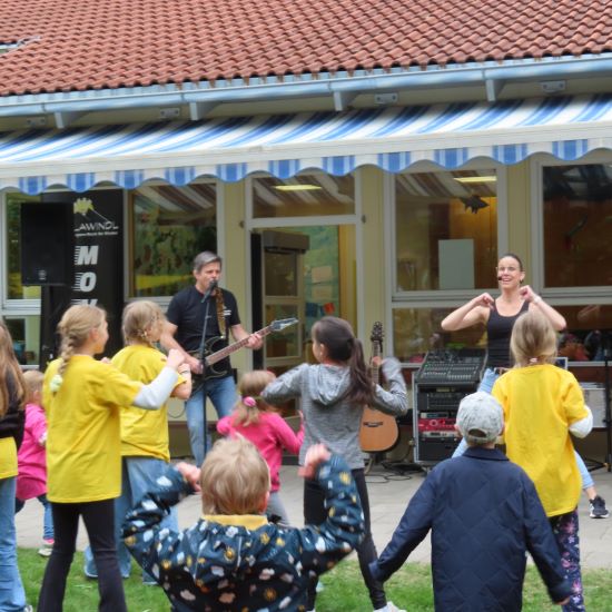 Großen Ereignissen eilen Schatten voraus. Die Vorboten hierfür waren drei „Kindertrainerinnen“ aus der Einrichtung. Sie übten rechtzeitig mit der Gesamtgruppe die Choreografie: „Work this Body“. Einheitlich in gelbe T-Shirts gekleidet, war dieser Tanz der Auftakt des Festes. Mitgebrachtes Fingerfood von den Hortfamilien ließ ein üppiges Buffet entstehen, an dem sich nach der Vorstellung alle gern bedienten. Im Rahmen einer großen Tombola konnte anschließend das Glück herausgefordert werden. Jedes Los war ein Treffer, ermöglicht durch Spenden von verschiedenen Echinger Fachbetrieben und Märkten aus der Umgebung. Zu guter Letzt animierte die Band „Schlawindl“ Kinder und Eltern mit rockiger Musik zu eigenen Moves, gefolgt von ruhigeren Songs mit Texten, die zum Nachdenken anregten.