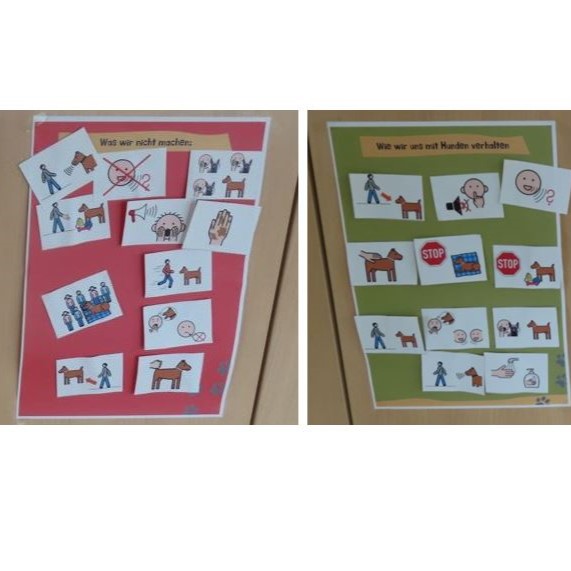 Auf das grüne Plakat kamen alle Karten, die darauf hinweisen „Wie wir uns mit Hunden verhalten“ und auf das rote Plakat „Was wir nicht tun“.