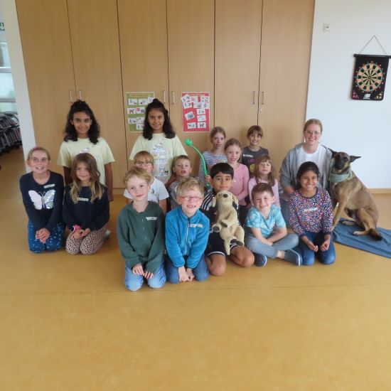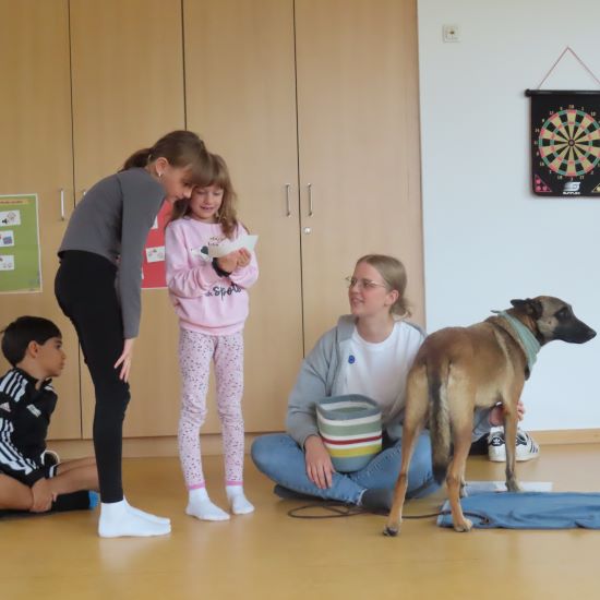 Am Mittwoch, 10.09.2025 besuchte uns Hund Smartie mit seiner Besitzerin Daniela Ring. Daniela und ihr Hund sind in Tiergestützter Pädagogik ausgebildet. Recht anschaulich und praxisnah wurde den Kindern der richtige Umgang mit Hunden vermittelt. Auch durfte jeder, der wollte, Smartie streicheln und ihm ein Leckerli geben.